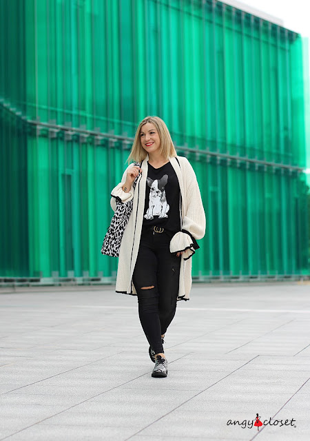 Las prendas del look, básicas, en blanco y negro, lisas. El toque original lo ponen los complementos, el estampado del calzado es divertido y el maxibolso, tambien en los mismos tonos, diferente estampado y muchas utilidades, igual lo llevo a clases con todo lo que necesito como me lo llevo al gimnasio, tiene una abertura en la parte delantera que permite llevar la esterilla.. Original y útil..